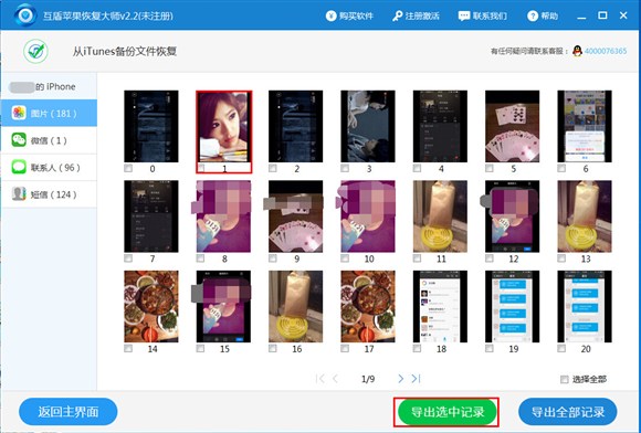 4、請點擊選擇“圖片”,然後在右側出現相對於的圖片文件,這時就可以看到蘋果手機誤刪的照片文件了,請勾選要恢復的文件,然後點擊“導出選中記錄”。