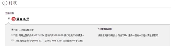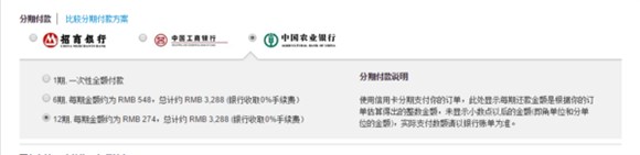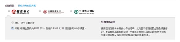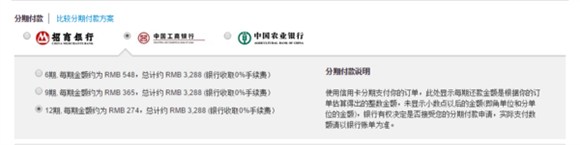 進來之後,挑選好想買的蘋果產品,就可以購買啦。在最後付款頁面可以選擇分期付款,招行可以選擇1期(一次性全額付款)、3期和12期免息付款。以iPhone SE 16GB為例,售價3,288元,選擇12期免息,分期每月最低約274元,免手續費。