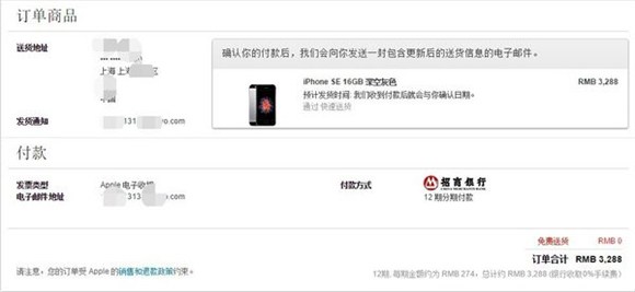 而且使用招行分期購買蘋果產品,每期還有積分入賬。雖然20元人民幣才積1分。確認付款後,Apple會發送一封包含更新後的送貨信息的電子郵件。然後就安靜地等著快遞吧。這樣一來,就算手頭比較緊也可以利用免息分期購買新機。