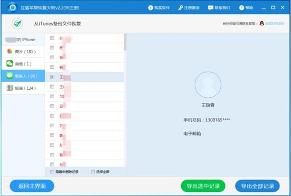 4、掃描完成以後我們就可以看到相關的數據文件,根據本文主題是需要解決蘋果手機通訊錄怎麼恢復以及備份手機通訊錄所以我們點擊聯系人即可。隨後軟件會將手機裡面的所有聯系人顯示出來。根據恢復通訊錄的需要我們可以勾選需恢復的單個聯系人也可以導出所有的聯系人進行恢復。