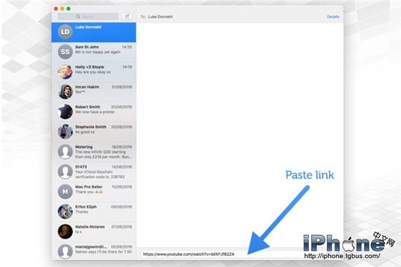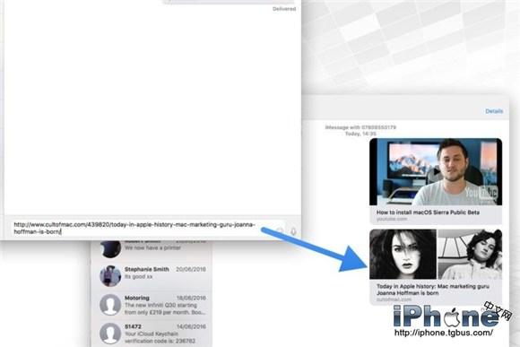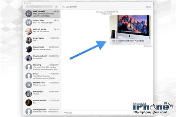 3、點擊發送之後,該鏈接會變成一個實時預覽窗口,我們可以在沒有單獨打開Safari浏覽器(或者其他浏覽器)窗口的情況下預覽視頻,但是目前的macOS Sierra beta系統還無法支持所有的視頻網站。