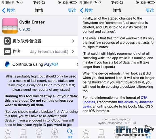 好在Cydia之父也並沒有讓大家等太久,今天saurik就為Cydia Eraser帶來了更新,本次更新最重要的就是帶來了對iOS 9.3.3的支持。也就是說如果你的設備現在是處於iOS 9.3.3的越獄狀態的話,那麼你就可以通過Cydia Eraser來讓設備恢復到iOS 9.3.3的原生系統,並將越獄狀態解除。換言之,所有安裝了的越獄插件包都會被移除,但會保留越獄時的系統版本。