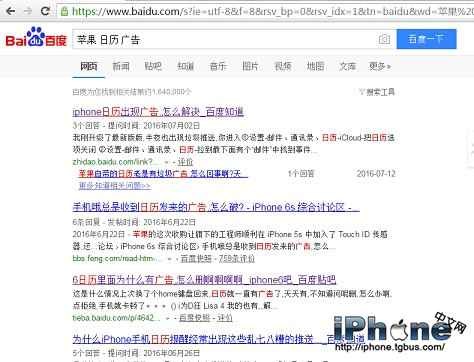 若在搜索引擎中搜索“蘋果日歷廣告”關鍵詞,其搜索結果前面數條均是由不同網友反應遇到此類事件: