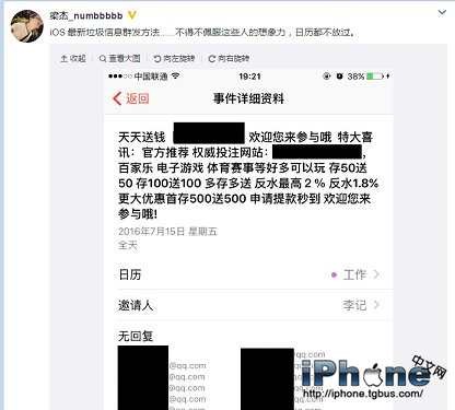 Ios教程網 >> IOS教程 >> 關於IOS教程 >> iPhone新釣魚手段收到日歷邀請 顯示垃圾信息