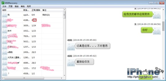 當前騰訊的QQ仍然是我們辦公和生活主要的即時通訊工具之一,不過最近我們發現iPhone蘋果手機用戶經常發生誤刪除QQ聊天記錄的情況。一旦QQ聊天記錄被誤刪除了我們該怎麼辦呢?這時不要著急應該立即關閉QQ工具,由於QQ所使用的數據庫對於刪除的記錄並沒有真正的物理刪除,只是打上了刪除標記的邏輯刪除,只要恢復及時還是有可能恢復的。在這裡小編將為大家介紹一種蘋果QQ記錄的刪除恢復方法,該方法非常簡單對於一般的手機用戶都可以獨立操作,僅僅需要三步並且無需發送數據文件,真正的有效保護用戶的個人隱私。下面是使用恢復工具MMRecovery實際恢復QQ聊天記錄的效果圖: