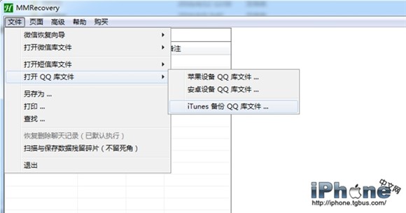運行QQ恢復工具MMRecovery,如下圖首先點擊“文件”菜單,再點擊“打開QQ庫文件”子菜單,最後再點擊“iTunes備份QQ庫文件”子菜單,將會彈出“iTunes備份QQ恢復”對話框。