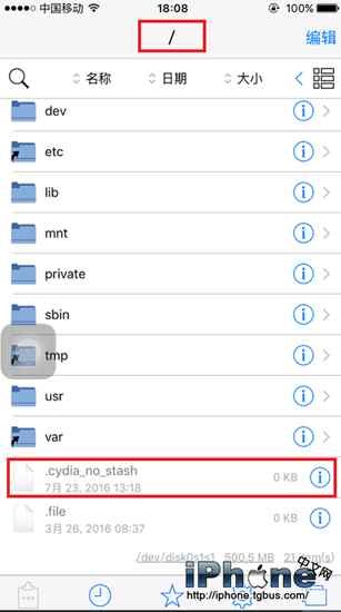 以Filza文件管理插件為示范,打開Filza,右滑到root目錄(/),上滑到底部找到。cydia_no_stash(cydia_no_stash不搬移)