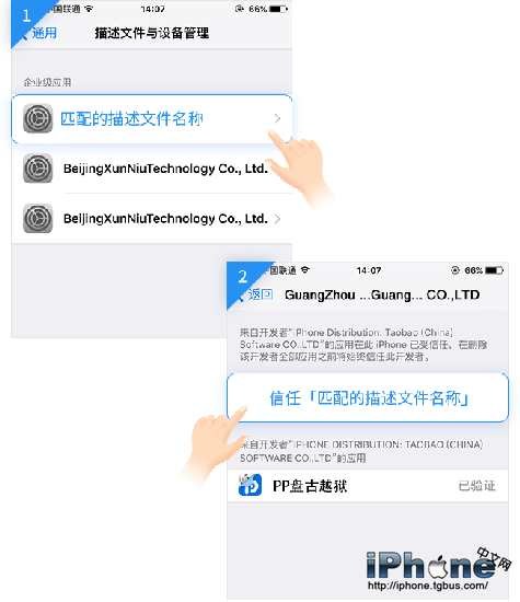 2、PP盤古越獄工具安裝成功後,在「設置」-「通用」-「描述文件與設備管理」完成應用信任設置