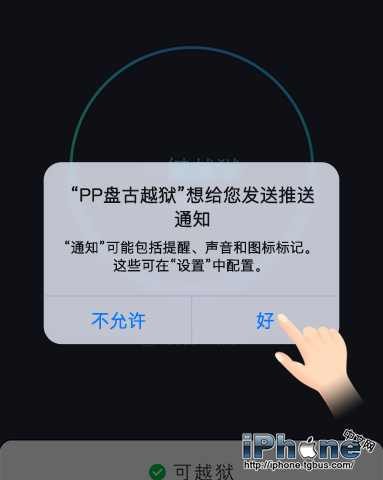 4、當系統提示【“PP盤古越獄”想給你推送通知】時,請點擊【好】來允許推送
