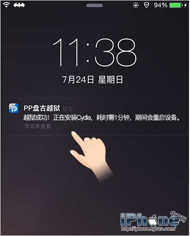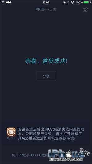 溫馨提示:如手機設備重啟後,越獄環境丟失(Cydia會丟失或閃退),再次使用越獄工具操作一次即可恢復越獄環境。