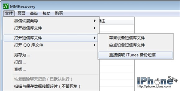 如下圖點擊菜單“文件”,再點擊“打開短信庫文件”,再點擊“直接讀取iTunes備份短信”,將會打開短信庫文件,就能查看當前備份短信的聊天記錄了。