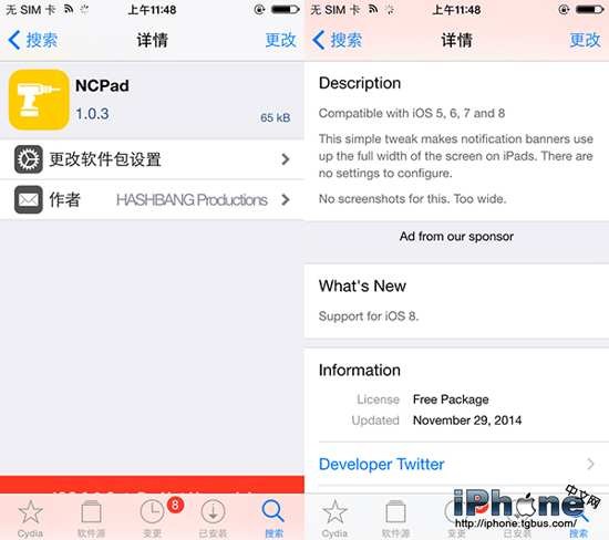 目前,該插件已兼容iOS 8及以下越獄系統,暫不支持iOS 9及以上系統。有興趣的小伙伴可以在BigBoss源中免費下載到該插件。
