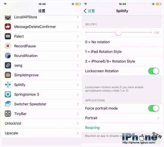 到“設置”>“Splitify”內,從SPLITIFY調整1或2,就能達成橫屏翻轉,如不想讓某款App也進行橫屏翻轉,可將“Force portrait mode”開啟,並設定“Portrait”選擇想排除的App即可,設定後別忘記點下“Respring”功能才會實現。