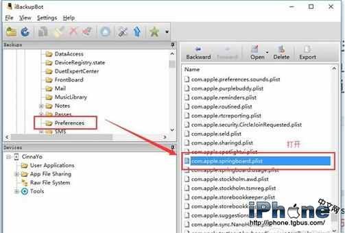 第二步,打開iBackupBot.exe,找到剛剛的備份,打開文件目錄Systemfiles-HomeDomin-library-Preferences,然後找到文件com.apple.springboard.plist並打開。
