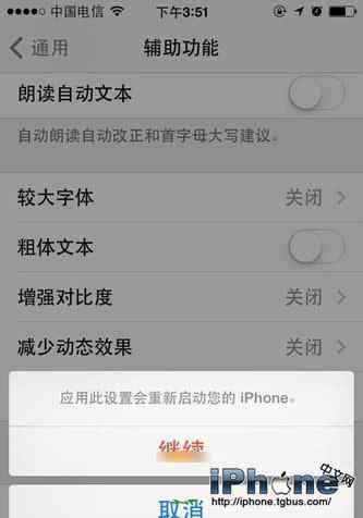 3、手機自動重啟,打開選項之後,系統會彈出一個關於重啟設備的咨詢窗口,點擊“繼續”即可!