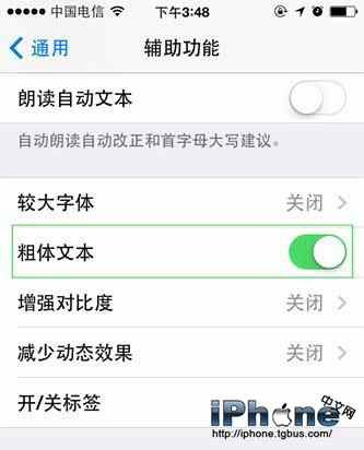 2、勾選“粗體文本”向下滑動,找到“粗體文字”,將右側的開關按鈕打開。