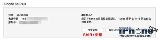 4.然後按住鍵盤上的 Shift(Option),同時鼠標點擊 iTunes 界面的【更新】按鈕,再選擇對應版本的 iOS10 beta 1固件進行升級。