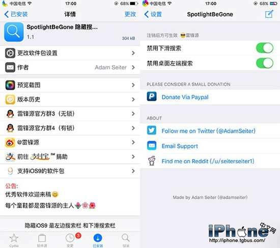 iOS9提供了兩種Spotlight搜索方式,一是在主頁向右滑會出現常用應用等,二是在主頁向下滑也能出現Spotlight界面,今天推薦的這款插件SpotlightBeB屏幕中向右滑動或向下滑動時出現的Spotlight頁面,可以單獨開關其中一種Spotlight,也可以同時兩個都關閉。