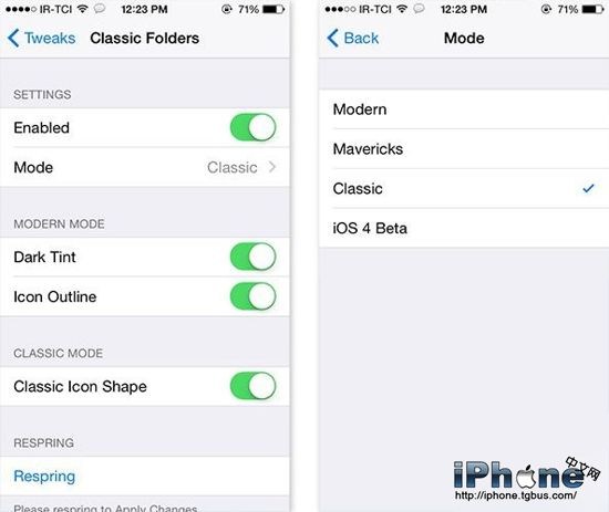 當你開啟現代風格的時候,還可以打開“IconOutline”和“DarkTint”的選項,這可以使得文件夾背景顏色深化。另一方面,如果你選擇經典模式的話,你就可以開啟“ClassicIconShape”來為文件夾圖標增加更厚的邊緣,就像iOS6一樣。每次作出變動都需要注銷設備才能生效,如果你對這款插件感興趣,不妨到BigBoss源進行下載,售價0.99美元,同時支持iOS7和iOS8,