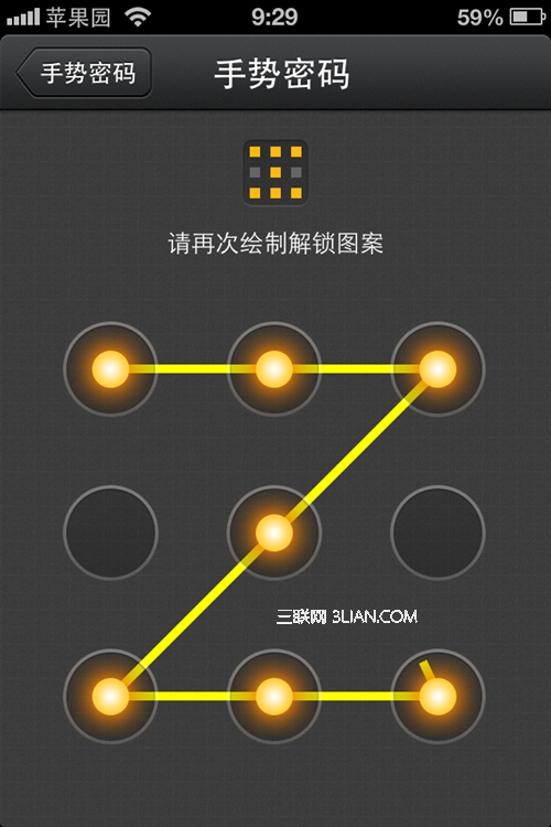 第6步:根據提示,設置你喜歡的手勢密碼即可(注意:手勢是在9個點上直線滑過)。