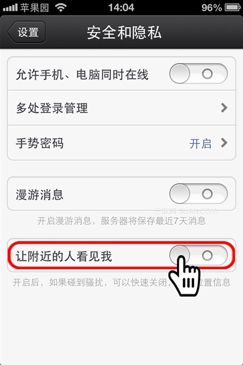 第10步:關閉讓附近的人看見我選項,該選項是防止自己被LBS定位,從而防止別人知道自己所在的具體位置。