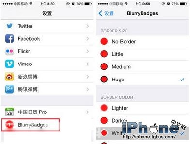 在Cydia中搜索安裝之後,在設置中可找到BlurryBadges,用戶可修改圖標的透明度、描邊的顏色等等,不過它只能自動匹配背景色彩,如果能自由修改將會更加有意思,不過需要用戶有一定的審美和色彩搭配能力,不然的話可能會越改越亂。