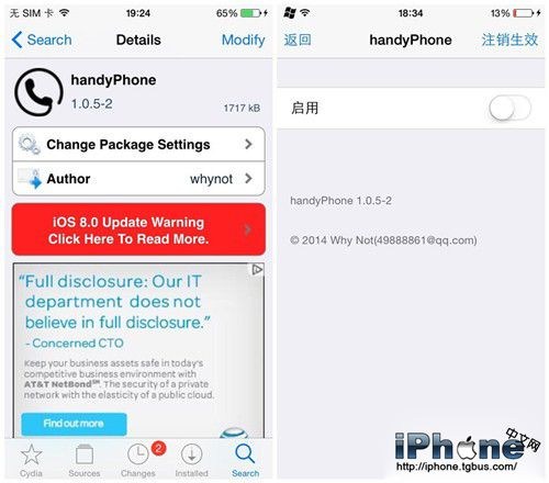 Handyphone插件為BigBoss自帶源所包含的,因此可以直接通過搜索框搜到,點擊打開該插件後直接點擊右上角的安裝(Install) 按鈕直接安裝即可。
