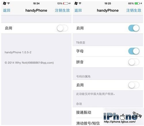 開啟插件的啟用按鈕後,即可顯示這款插件所包含的主要功能設置選項,主要包括:T9類型字母或拼音鍵盤選擇、號碼歸屬地顯示以及其他雜項。需要注意的是,當用戶根據需求確定後,需要設備注銷重啟方可生效。