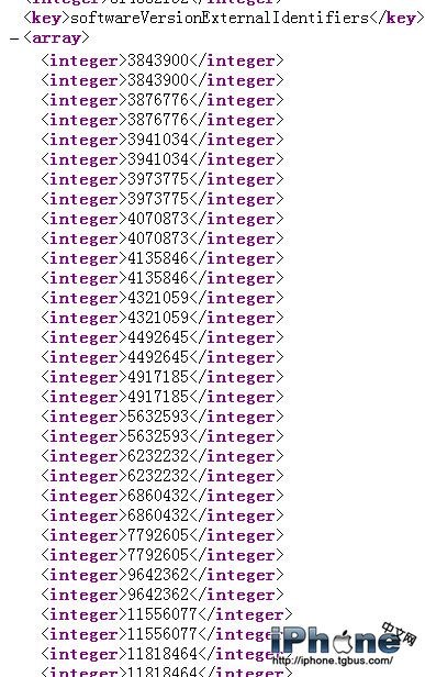 7. 打開保存的 xml 文件(系統默認一般是 IE 打開),向下翻動找到 softwareVersionExternalIdentifiers 並伴隨著一大串 “xxxxxxxxxx”的項目。此處為該 App 自第一個版本起每個版本在 App Store 中的版本 ID,從後向前即為最新到最老。
