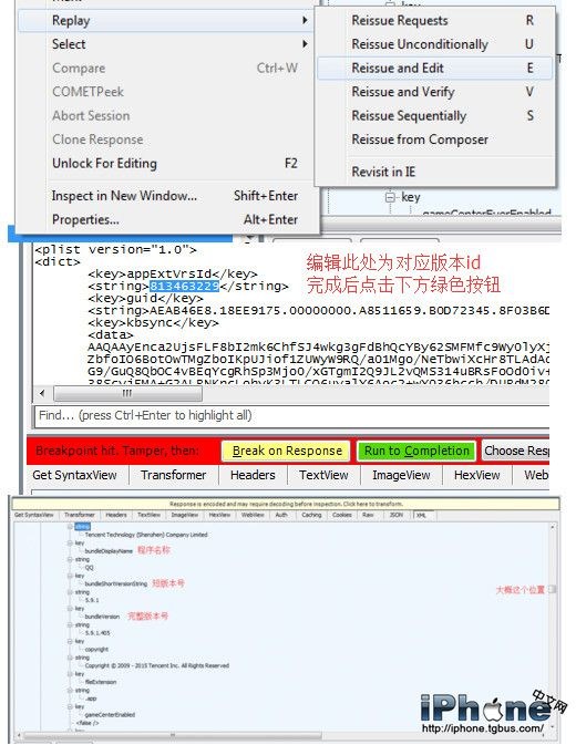 8. 回到 Fiddler,右鍵之前那個 MZBuy 的請求,Replay-Reissue and Edit,編輯右側上方 appExtVrsId 下方數字為對應版本 ID,本教程直接使用 QQ 5.9.1 版本的 ID813463229,點擊綠色按鈕,切換至黃色塊下方最右側“xml”視圖,下拉至圖中位置查看 App 版本,不斷重復本步驟直至找到需要下載的版本。如果無法正常獲取則說明請求已經過期,重新執行 3-4 步然後使用新的請求進行編輯重發操作。