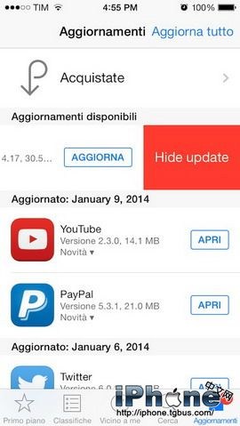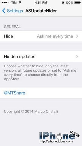 大家都知道在AppStore下載一個App之後,每當有版本更新,AppStore都會不斷發出更新提示,如果用戶既不想更新,又不希望 AppStore提示的話,這款《ASUpdateHider》可以讓你解決這個問題。安裝插件之後會在App更新列表中添加滑動隱藏功能,點擊選擇即 可隱藏更新提示。