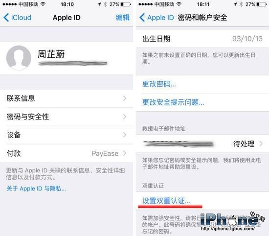 在手機裡打開‘設置’- ‘iCloud’,點擊自己的賬號,輸入密碼進入 Apple ID 的設置頁面。之後選擇‘密碼與安全性’- ‘設置雙重認證’,按照步驟驗證電話號碼即可。