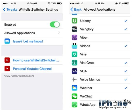 安裝WhitelistSwitcher之後,用戶可以在設置應用中找到這款插件的偏好面板,建立白名單,並可以在偏好面板中可選擇打開 /禁用該插件。