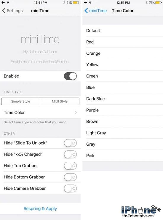 同時,利用 miniTime 可以改變時間和日期的顏色,共有 11 種預設顏色。在 miniTime 中設置好想要的時間、日期外觀後,需要注銷設備一遍使改變生效。安裝 miniTime 後,會在系統設置中出現對應條目,插件還提供啟用開關、隱藏“滑動以解鎖”/電量百分比/相機快捷方式等選項。