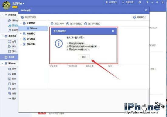 一、打開iTunes,斷開iOS設備與電腦的連接。長按【Home鍵】+【電源鍵】8秒強制關機 -- 關機後長按【Home鍵】鍵8秒--通過USB數據線連接電腦,或者請把設備鏈接電腦,先按住【電源鍵】2~3秒,然後繼續同時按住【電源鍵】和【Home鍵】,持續到第10秒的時候,請立即松開【電源鍵】,並繼續保持按住【Home鍵】,直到在電腦上看到識別到DFU狀態下的USB設備時就進入到DFU模式了,這個時候iTunes會自動或者手動啟動。