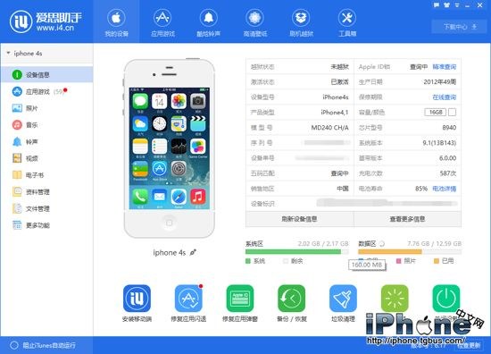 拿到iPhone後,可以用數據線把手機連接到電腦上,到下載最新版的愛思助手,連接之後就能識別出你的手機的信息、型號、儲存容量、和系統。這樣就能防止某些商家售出的套著iPhone殼的高仿Android機。