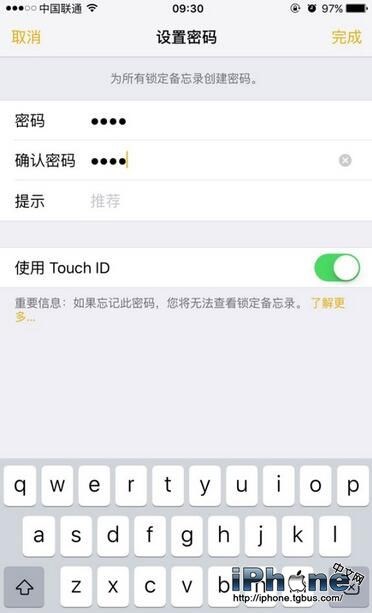 4.輸入密碼,如果忘記這個密碼,我們將無法查看鎖定的備忘錄中所記錄的內容,因此我們最好設置一些提示信息。當然,我們可以開啟“使用Touch ID”,不用每次都輸入內容。
