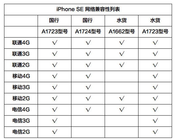 既然是手機,那麼一定繞不開運營商,雖然現在技術上已經能實現全網通,但是鑒於國情,總是會偶爾出現點不合群的情況。根據蘋果官網最新的信息,本次 iPhone SE 共計有 3 種型號,分別為 A1662、A1723、A1724,其中 A1723 為全網通型號,並且行水均有,以常見的四個版本為例,具體差異請看下圖。