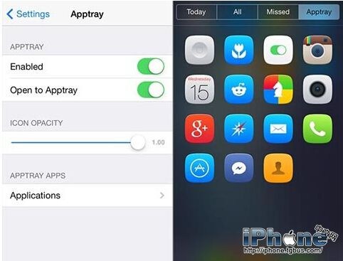 安裝 Apptray 後,可前往“設置”找到“Apptray”來添加你想放到通知中心的應用程序。你還可以調節在通知中心的應用圖標透明度,也能在設置中禁用或開啟 Apptray。
