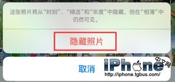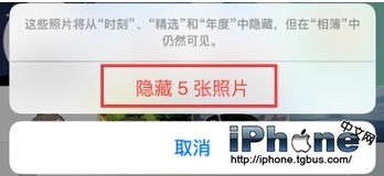 系統將會在頁面下方彈出一個提醒窗口:這張照片將從“時刻”、“精選”和“年度”中隱藏,但在“相簿”中仍然可見,確認的話直接點擊【隱藏照片】即可