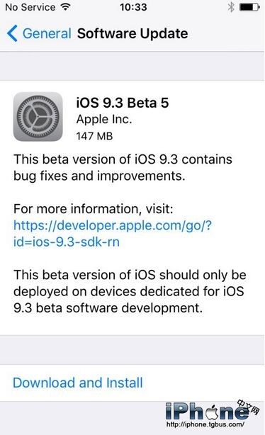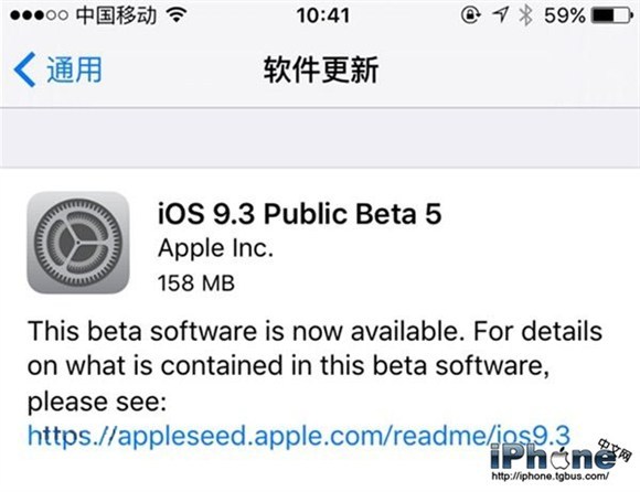 2、打開設備的設置-通用-軟件更新,選擇【下載並安裝】iOS9.3 beta5,下載完成後選擇安裝即可將iPhone升級至最新的iOS9.3 beta5 。此前已安裝了iOS9.3 beta版更新的iPhone只需要在收到OTA升級提示時選擇確定即可自動升級。