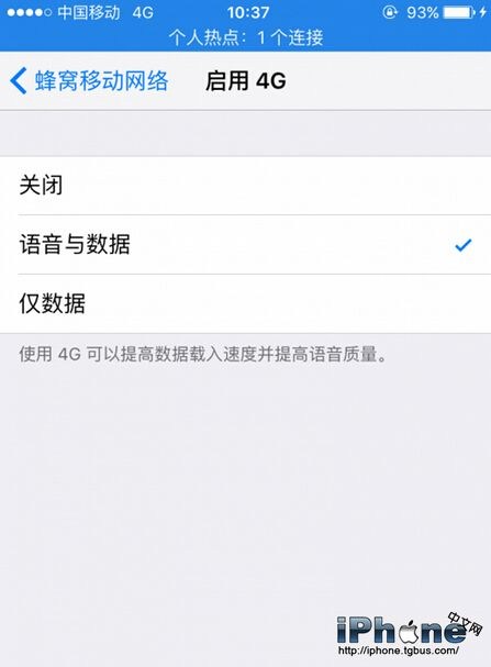 -iPhone手機設置啟用VoLTE:進入設置-蜂窩移動網絡-啟用4G”,可以看到“關閉”、“語音與數據”和“僅數據”這三個選項,“語音與數據”表示為開啟VoLTE,“僅數據”表示為關閉VoLTE,“關閉”則是關閉4G網絡。