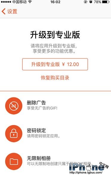 GIF Viewer分為免費版和專業版(收費版)兩種,免費版支持從系統自帶照片應用中讀取gif圖片,允許用戶自行創建有限的gif圖片相冊以及支持通過連接電腦傳輸gif圖片到應用中。而專業版則是在此基礎上新增了去廣告、密碼鎖定、無限制創建gif相冊、觀看gif暫停畫面以及調節照片播放速度、將gif切換到視頻等功能。升級到專業版的價格為12元。