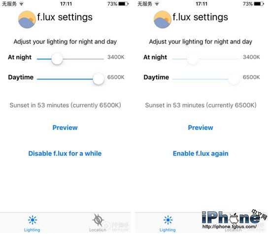 簡單來說,f.lux可以根據用戶所在的位置和使用iPhone的時間,來自行調節手機屏幕的亮度及色溫,以便保證不管什麼時候點亮屏幕,都能夠擁有最舒適的屏幕視覺效果。一般情況下,f.lux會自行為你調節白天冷色調,夜晚暖色調。這樣的設定能夠有效的保護眼睛。
