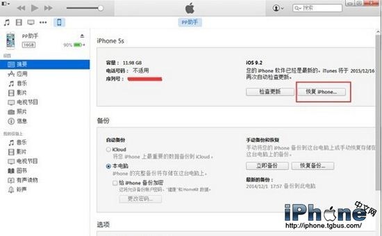 3、設備連接iTunes,按住鍵盤上的Shift鍵(Mac系統上按住alt鍵),鼠標點擊“恢復iPhone”,選擇已下載好的iOS9.2固件,確認恢復之後等待iTunes自動運行完成即可。