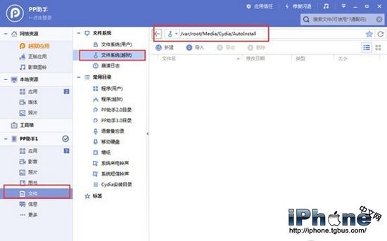 2、設備連接PP助手電腦版,在【文件-文件系統(越獄)】中找到路徑【/var/root/Media/Cydia/AutoInstall】,導入已下載的微信/QQ插件deb文件,然後重啟設備即可自動安裝完成。