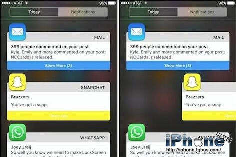 此外,在卡片式的通知中心界面下,用戶長按任意卡片的頂部就能喚出清除所有通知的按鈕。若是要清除單個卡片,只需向左滑動然後點擊“X”即可。