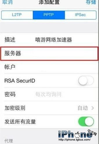 3、在添加VPN中選擇PPTP,點擊進入,在“描述”欄中填入嘻游。在服務器欄中填入能夠使用得服務器地址:聯系QQ79490724獲得該服務器,在賬戶和密碼欄中填入嘻游用戶名和密碼。其他設置保持不變,然後點擊儲存,注意加密級別要選擇自動,不加密連接不上服務器。
