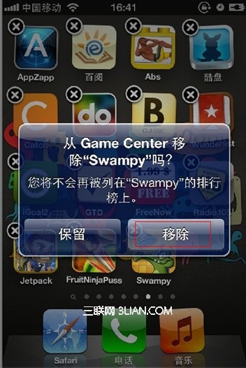 (3)重啟後,在手機上卸載程序,請把Game center 數據排名移除。如圖:把Game Center 的數據也移除。