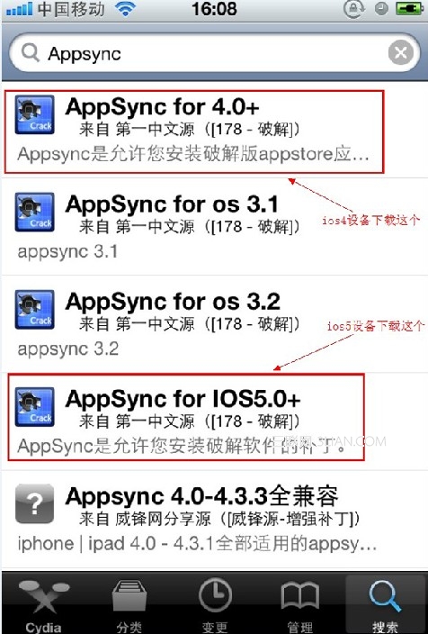 (2)注銷後,在cydia源裡加入一個App sync for ios5.0+ 如果之前安裝過的,請先卸載,重新安裝一次。(如果你是ios4的設備,就安裝Appsync for 4.0+源)